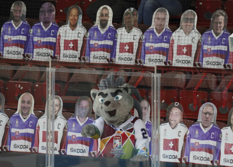Maskot MS v hokeji 2021 v prázdnom hľadisku Olympijského športového centra počas zápasu Slovensko - Švajčiarsko. Riga, 27. máj 2021. Foto: SITA/AP.