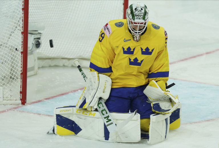 Zákrok švédskeho gólmana Adama Reideborna počas zápasu proti Česku na MS v hokeji 2021. Riga, 27 máj 2021. Foto: SITA/AP.