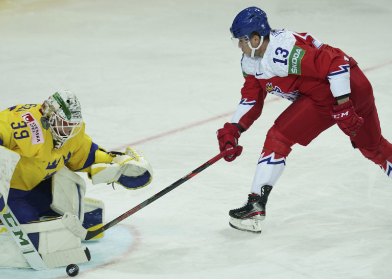 Zákrok švédskeho gólmana Adama Reideborna po zakončení českého útočníka Jana Kovářa počas zápasu na MS v hokeji 2021. Riga, 27. máj 2021. Foto: SITA/AP.