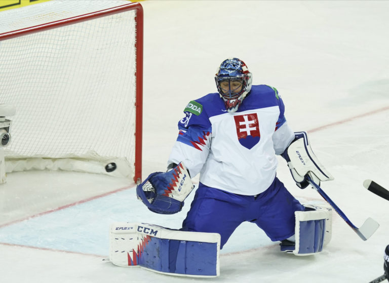Zákrok slovenského gólmana Júliusa Hudáčka v zápase proti Švajčiarsku na MS v hokeji 2021. Riga, 27. máj 2021. Foto: SITA/AP.