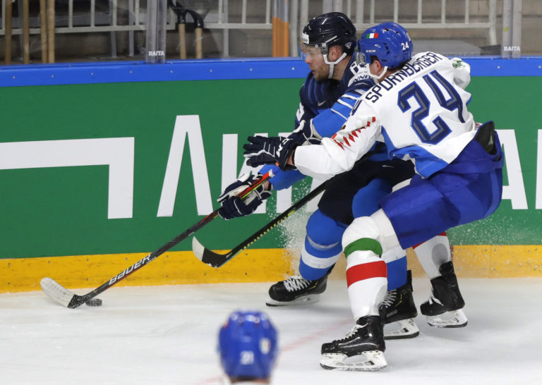 Fínsky útočník Arttu Ruotsalainen padá po súboji s Talianom Petrom Spornbergerom počas zápasu na MS v hokeji 2021. Riga, 27. máj 2021. Foto: SITA/AP.