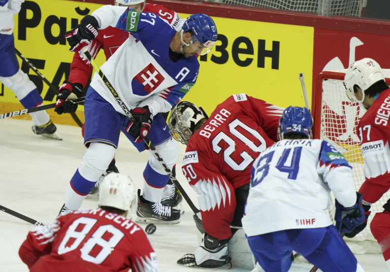 Slovenský útočník Marek Hrivík sa snaží prekonať švajčiarskeho gólmana Reta Berru počas zápasu na MS v hokeji 2021. Riga, 27. máj 2021. Foto: SITA/AP.