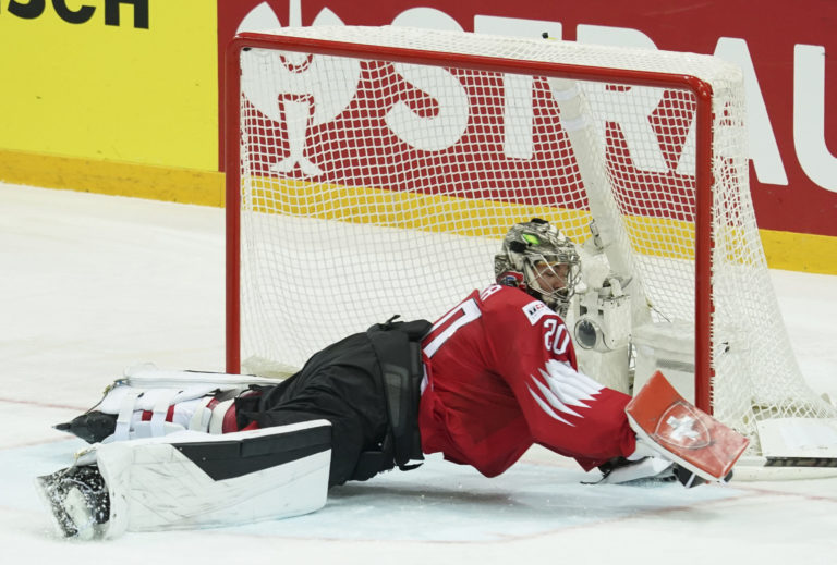 Zákrok švajčiarskeho gólmana Reta Berru počas zápasu proti Slovensku na MS v hokeji 2021. Riga, 27. máj 2021. Foto: SITA/AP.