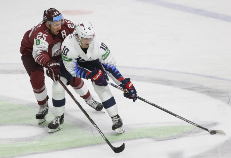 Lotyš Andris Džeriňs v súboji s americkým útočníkom Mattym Beniersom počas zápasu na MS v hokeji 2021. Riga, 27. máj 2021. Foto: SITA/AP.