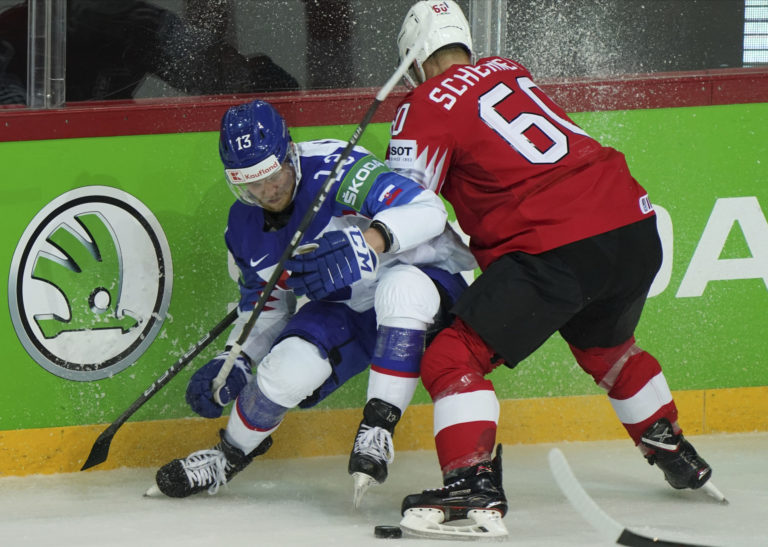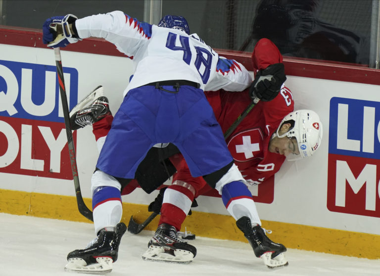 Švajčiar Christoph Bertschy v súboji so slovenským útočníkom Róbertom Lantošim počas zápasu na MS v hokeji 2021. Riga, 27. máj 2021. Foto: SITA/AP.