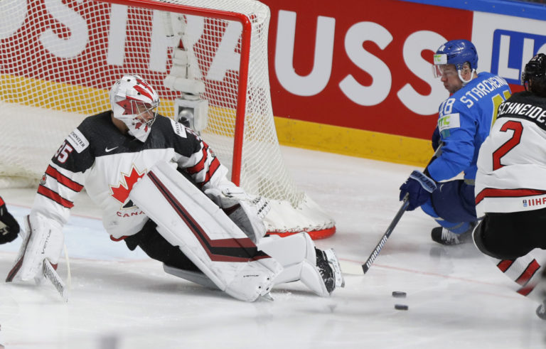 Kanadský gólman Darcy Kuemper odrazil puk, ktorý vystrelil reprezentant Kazachstanu Roman Starchenko (vpravo) počas zápasu na MS v hokeji 2021. Riga, 28. máj 2021. Foto: SITA/AP