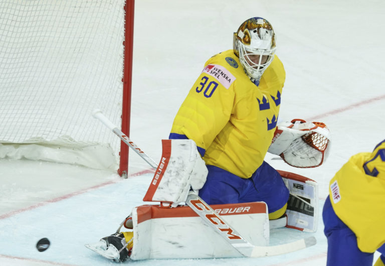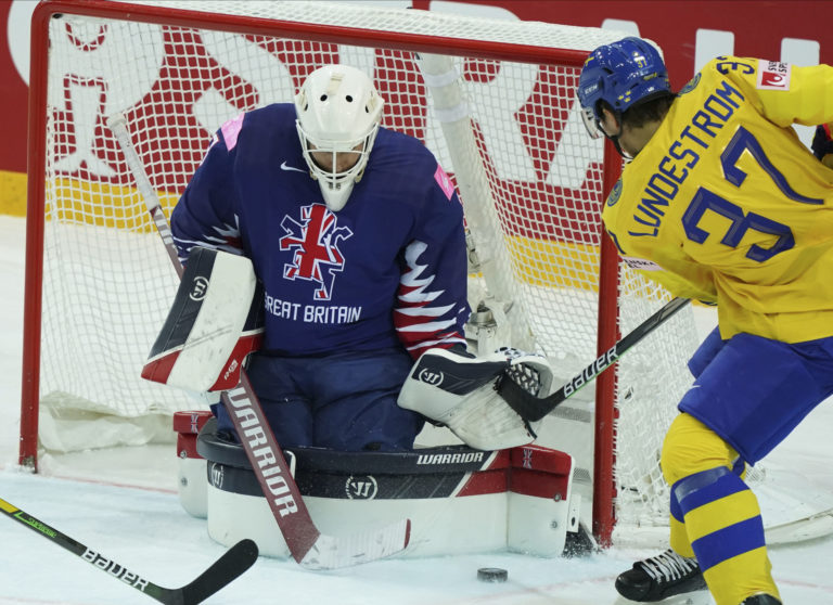 Zákrok švédskeho gólmana Viktora Fastha počas zápasu proti Veľkej Británii na MS v hokeji 2021. Riga, 28. máj 2021. Foto: SITA/AP