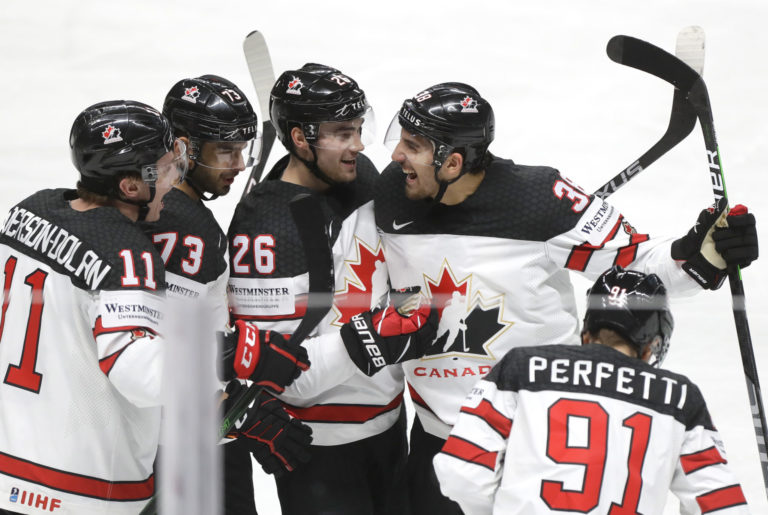 Kanadskí hokejoví reprezentanti sa tešia z gólu v sieti Veľkej Británie, ktorý strelil Cole Perfetti počas zápasu na MS v hokeji 2021. Riga, 28. máj 2021. Foto: SITA/AP
