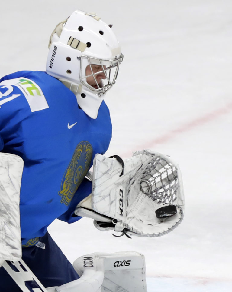 Gólman Kazachstanu Andrei Shutov s pukom počas zápasu na MS v hokeji 2021. Riga, 28. máj 2021. Foto: SITA/AP.