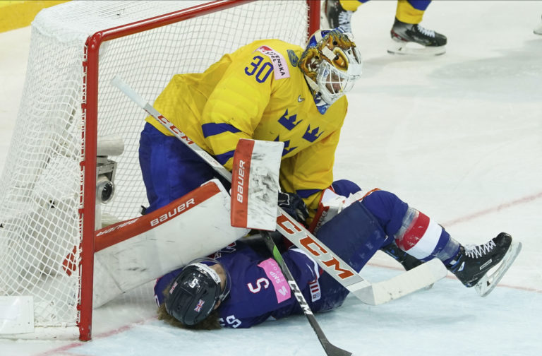 Zákrok švédskeho gólmana Viktora Fastha, ktorý sa snaží získať puk počas zápasu na MS v hokeji 2021. Riga, 28. máj 2021. Foto: SITA/AP.