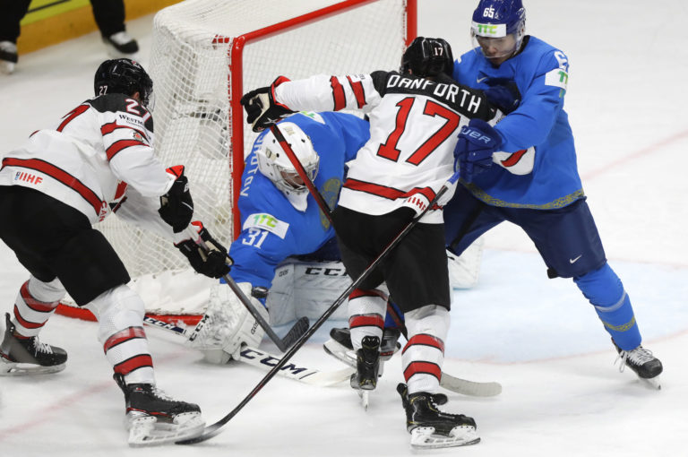 Gólman Kazachstanu Andrei Shutov (uprostred) sa snaží chytiť puk kanadského reprezentanta Connora Browna (vľavo) počas zápasu na MS v hokeji 2021. Riga, 28. máj 2021. Foto: SITA/AP.