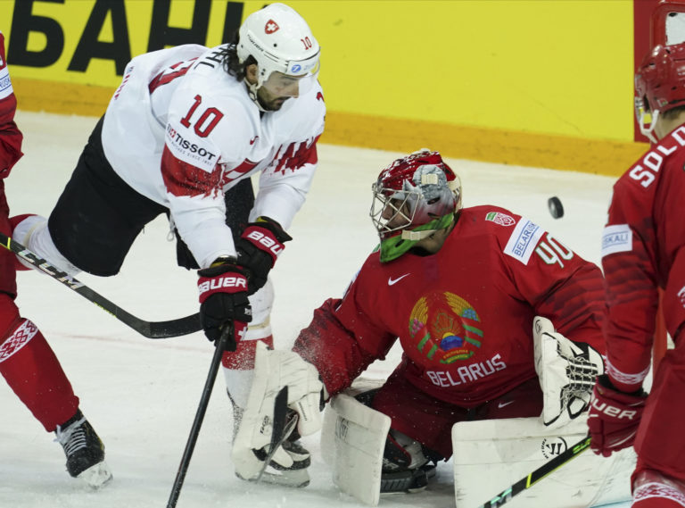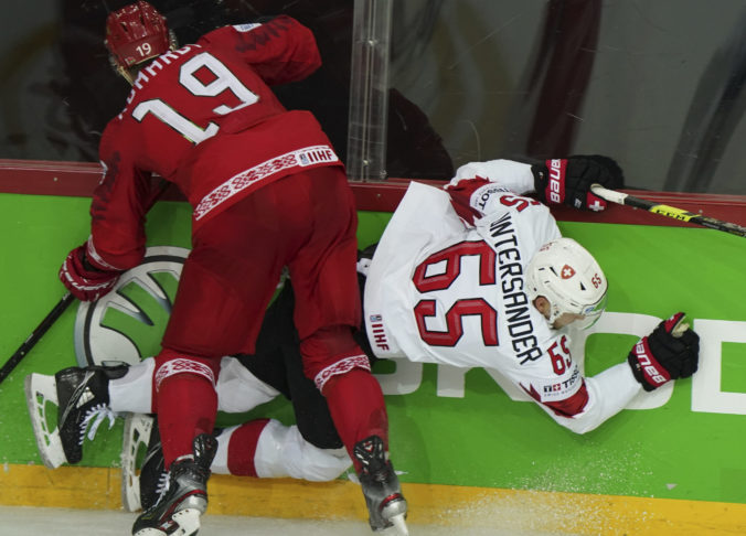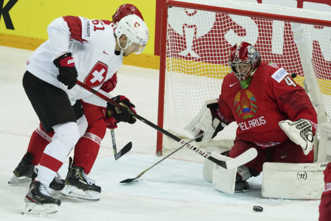 Švajčiar Joel Vermin počas zápasu medzi Bieloruskom a Švajčiarskom na MS v hokeji 2021. Riga, 30. máj 2021. Foto: SITA/AP
