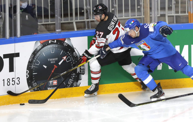 Talian Alex Trivellato (vpravo) a Kanaďan Michael Bunting počas zápasu medzi Talianskom a Kanadou. Riga, 30. máj 2021. Foto: SITA/AP
