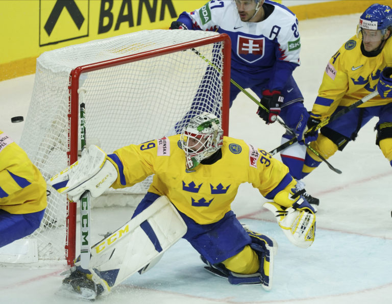 Zákrok švédskeho gólmana Adama Reideborna počas zápasu proti Slovensku na MS v hokeji 2021. Riga, 30. máj 2021. Foto: SITA/AP.