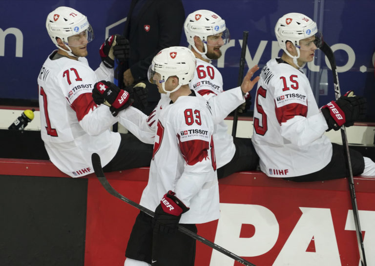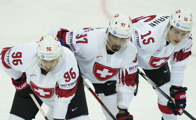 Zľava: Švajčiarski hokejisti Noah Rod, Jonas Siegenthaler, Gregory Hofmann počas MS v hokeji 2021 medzi Bieloruskom a Švajčiarskom v Rige. 30. máj 2021 Foto: SITA/AP
