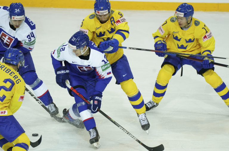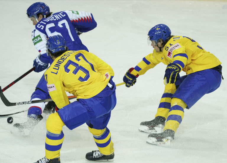 Švédi Isac Lundestrom a Filip Hållander sa snažia zastaviť prenikajúceho slovenského útočníka Mariána Studeniča počas zápasu na MS v hokeji 2021. Riga, 30. máj 2021. Foto: SITA/AP.