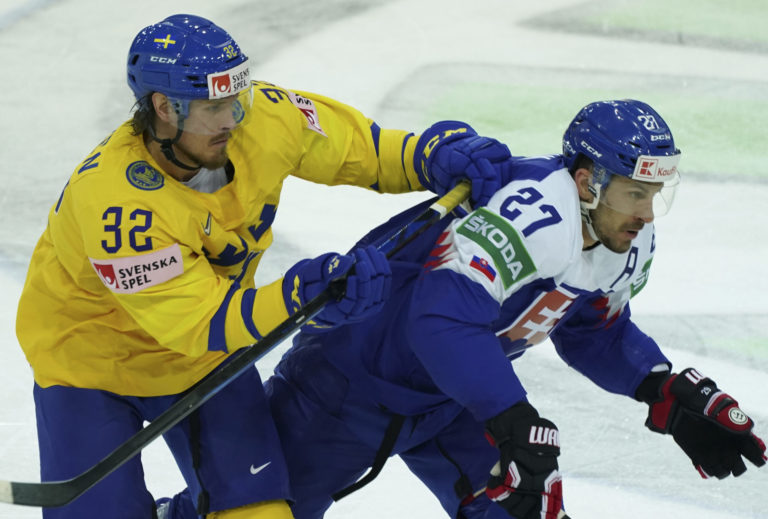 Slovenský útočník Miloš Kelemen v súboji so Švédom Klasom Dahlbeckom počas zápasu na MS v hokeji 2021. Riga, 30. máj 2021. Foto: SITA/AP.