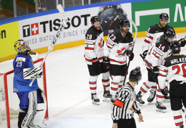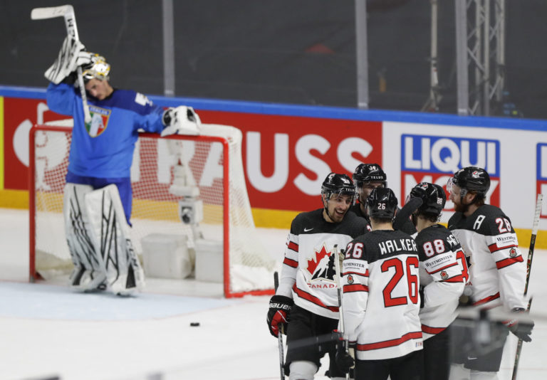 Taliansky brankár Davide Fadani (vľavo) reaguje na oslavu hráčov Kanady po tom, čo Kanaďan Brandon Pirri strelil siedmy gól počas zápasu medzi Talianskom a Kanadou na MS v hokeji 2021. Riga, 30. máj 2021. Foto: SITA/AP
