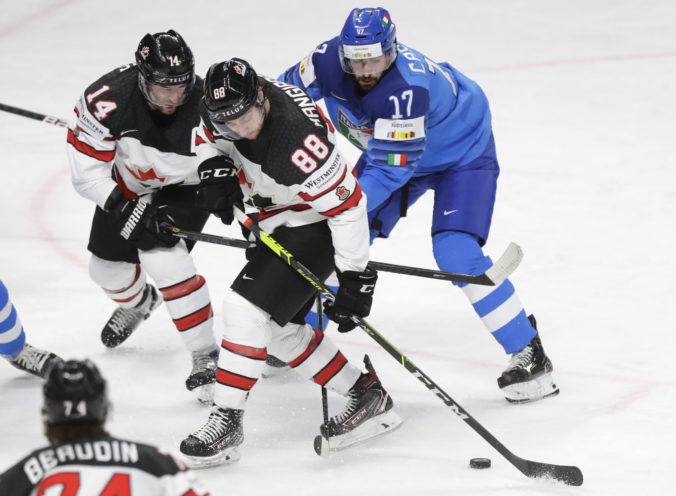 Talian Lorenzo Casetti (vpravo) bojuje o puk s Kanaďanom Andrewom Mangiapanom (stred) a Kanaďanom Adamom Henriqueom počas zápasu medzi Talianskom a Kanadou. Riga, 30. máj 2021. Foto: SITA/AP