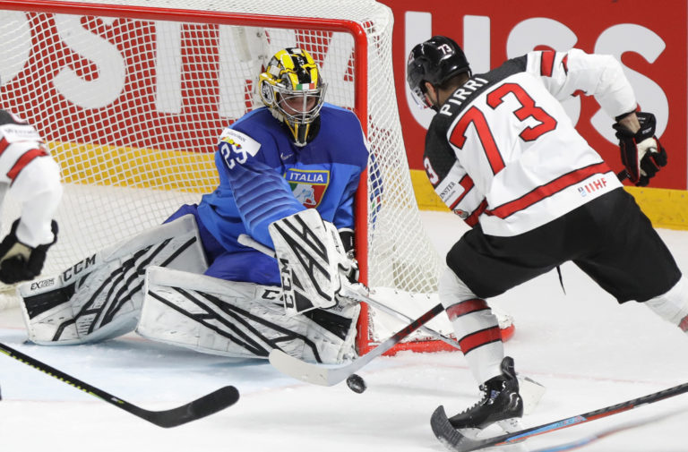 Kanaďan Brandon Pirri (vpravo) a taliansky brankár David Fadani počas zápasu medzi Talianskom a Kanadou. Riga, 30. máj 2021. Foto: SITA/AP