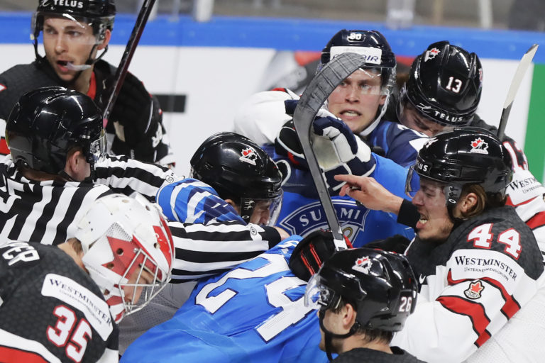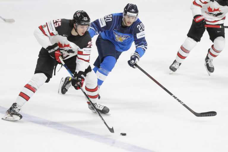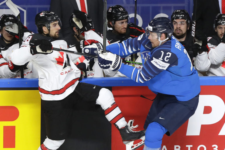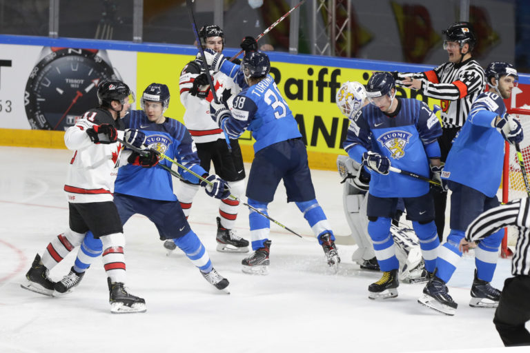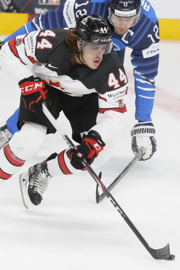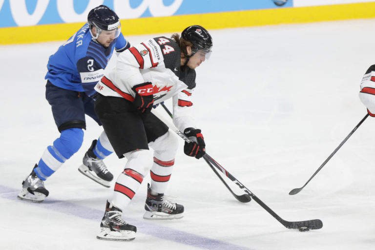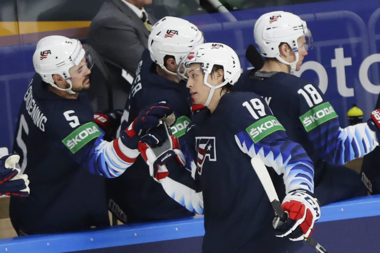 Americký hokejový reprezentant Ryan Donato sa snaží udržať puk počas zápasu o tretie miesto na MS v hokeji 2021. Riga, 6. jún 2021. Foto: SITA/AP.