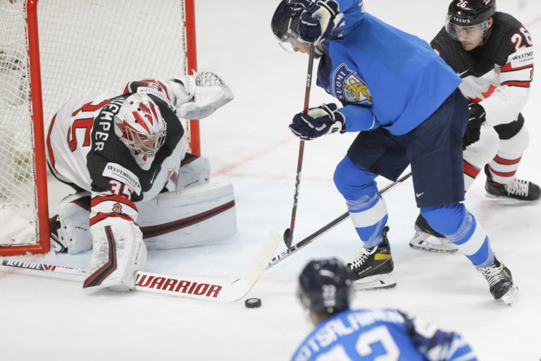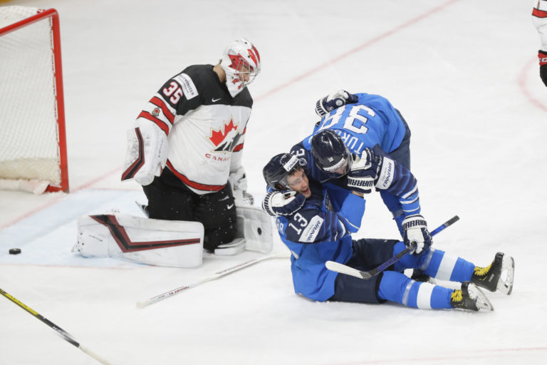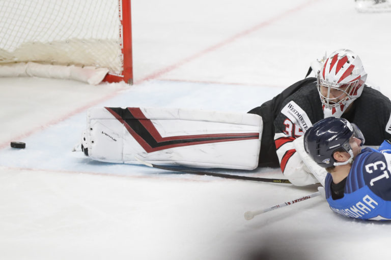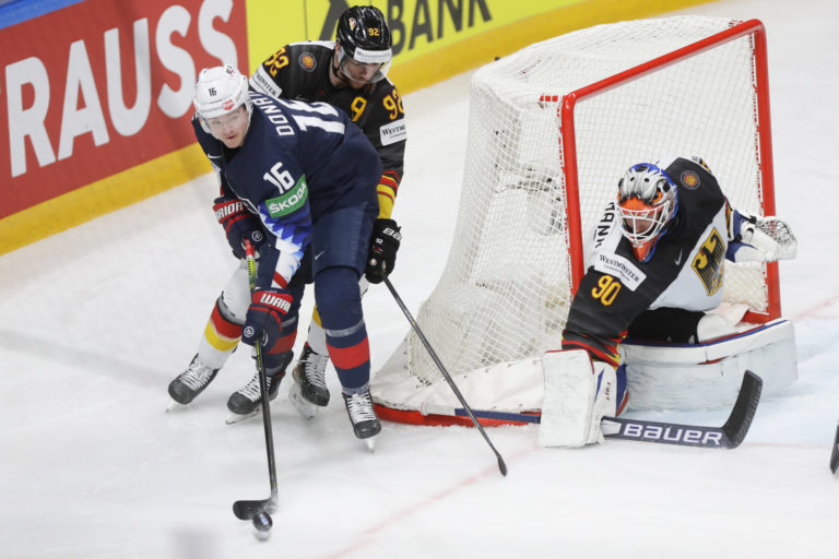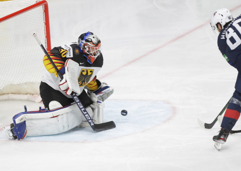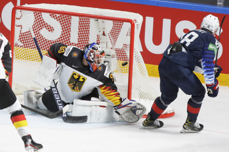 Nemecký gólman nechytil puk, ktorý strelil do jeho brány americký reprezentant Jack Drury počas zápasu o tretie miesto na MS v hokeji 2021. Riga, 6. jún 2021. Foto: SITA/AP.