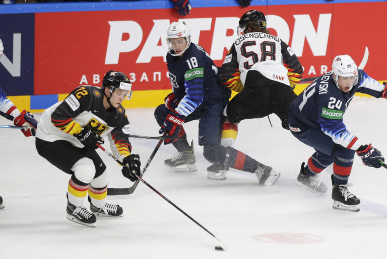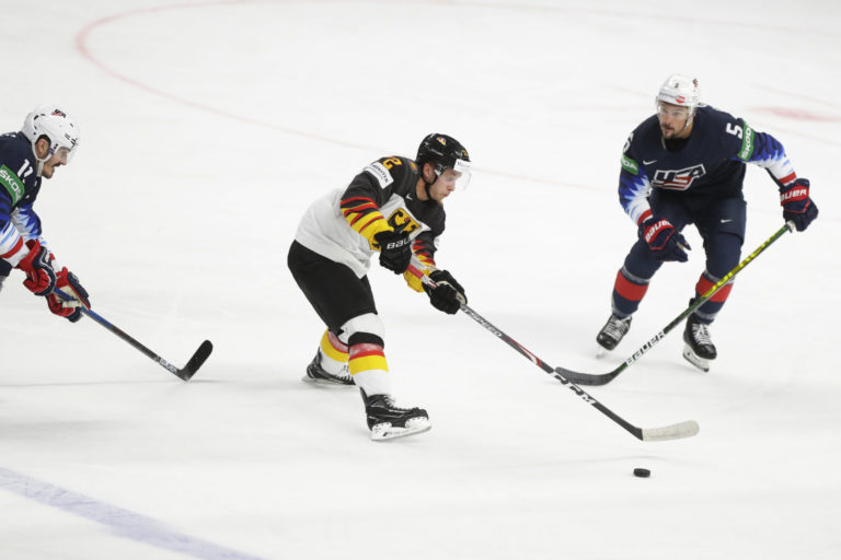 Nemecký hokejový reprezentant Dominik Kahun sa snaží dostať s pukom cez amerických hokejistov Briana Boyla a Adama Clendeninga počas počas zápasu o tretie miesto na MS v hokeji 2021. Riga, 6. jún 2021. Foto: SITA/AP.
