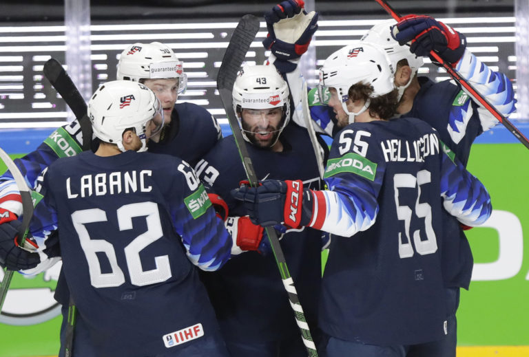 Radosť amerických hokejistov po góle Colina Blackwella v sieti Slovenska počas štvrťfinálového zápasu na MS v hokeji 2021. Riga, 3. jún 2021. Foto: SITA/AP.