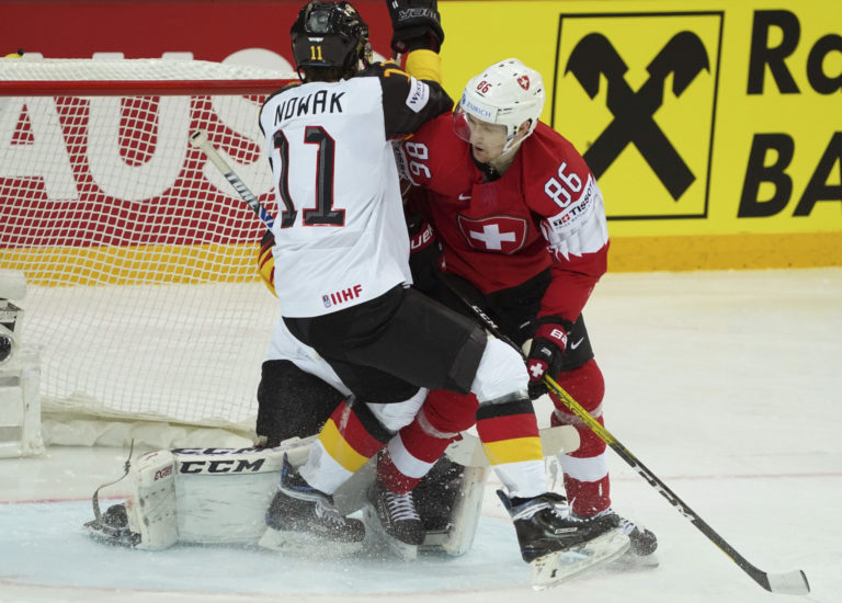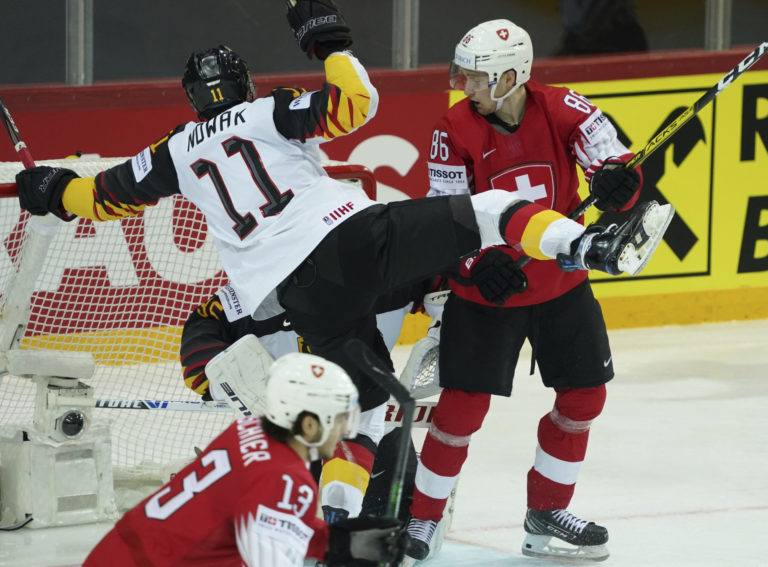 Janis Moser zo Švajčiarska (vpravo) a Marco Nowak z Nemecka v súboji počas štvrťfinálového zápasu na MS v hokeji 2021. Riga, 3. jún 2021. Foto: SITA/AP