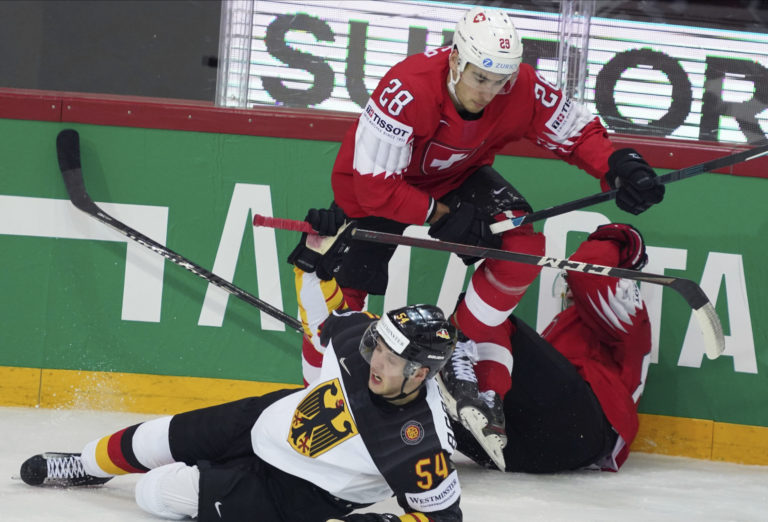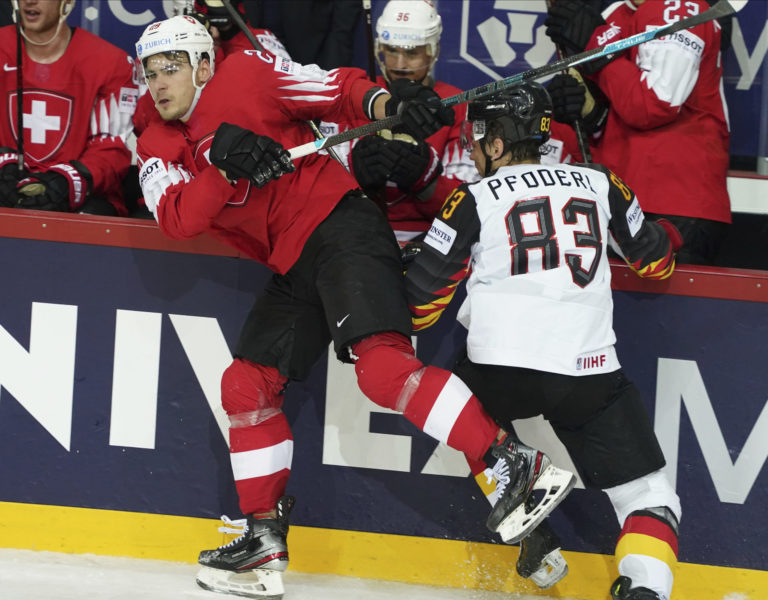 Mirco Müller zo Švajčiarska (vľavo) a Leonhard Pfoderl z Nemecka v súboji počas štvrťfinálového zápasu na MS v hokeji 2021. Riga, 3. jún 2021. Foto: SITA/AP
