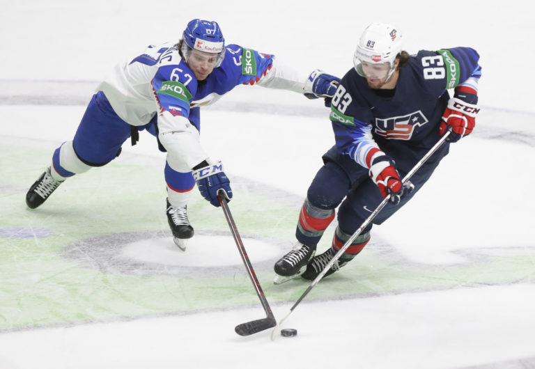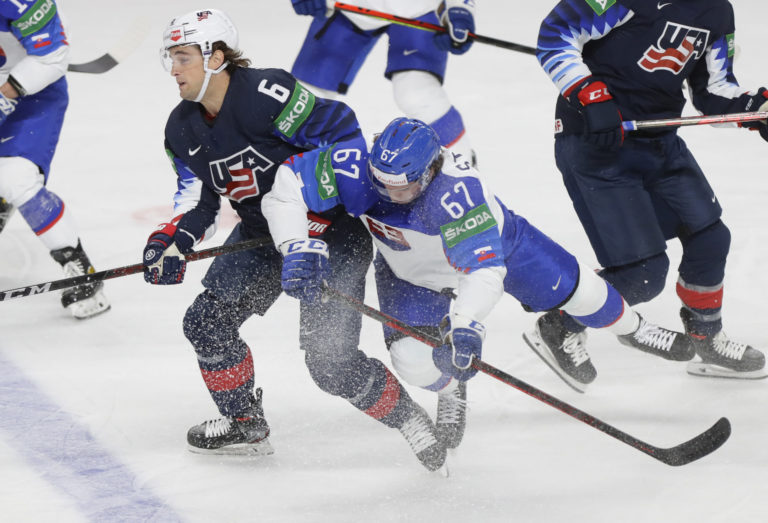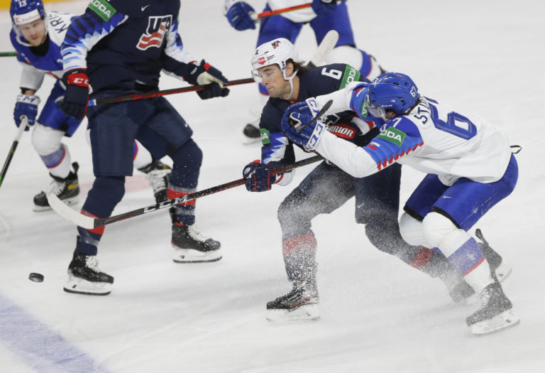 Slovenský reprezentant Marián Studenič sa snaží zastaviť amerického útočníka Conora Garlanda počas štvrťfinálového zápasu na MS v hokeji 2021. Riga, 3. jún 2021. Foto: SITA/AP.