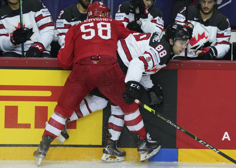 Ruský obranca Arťom Zub v súboji s Kanaďanom Andrewom Mangiapanem počas štvrťfinálového zápasu na MS v hokeji 2021. Riga, 3 jún 2021. Foto: SITA/AP.