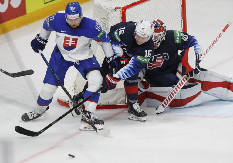 Slovenský útočník Kristián Pospíšil v súboji s Američanom Ryanom Donatom pred brankárom Calom Petersenom počas štvrťfinálového zápasu na MS v hokeji 2021. Riga, 3. jún 2021. Foto: SITA/AP.