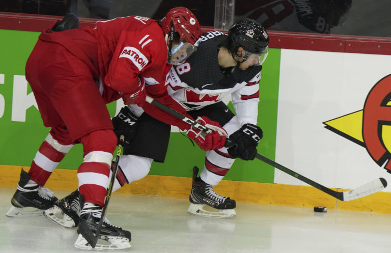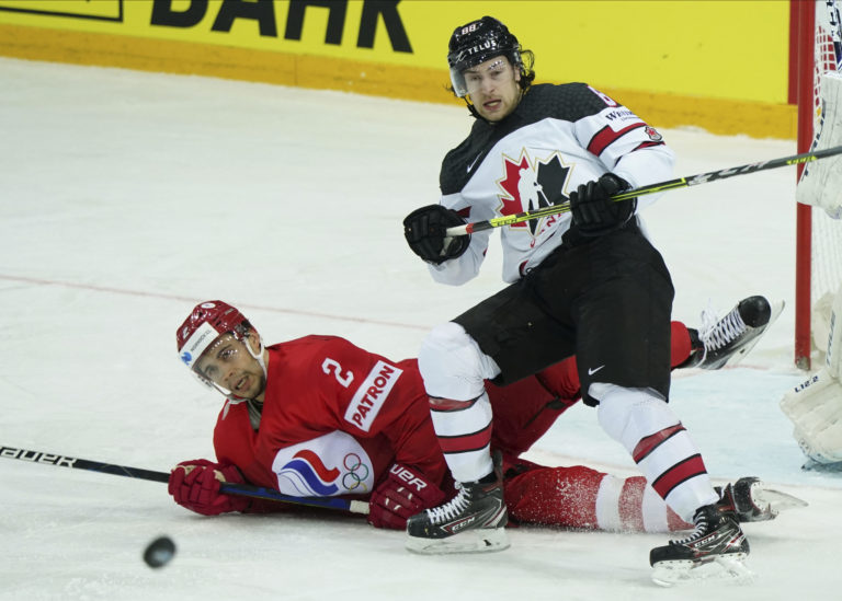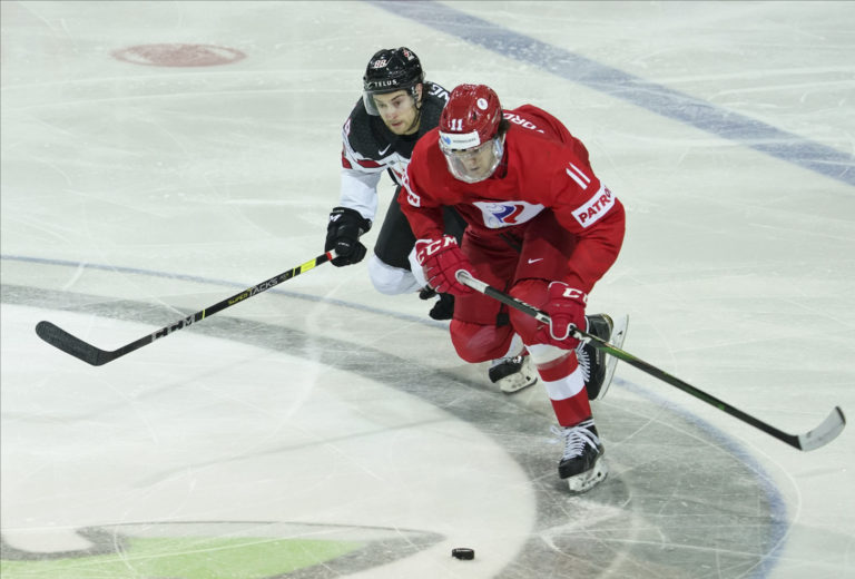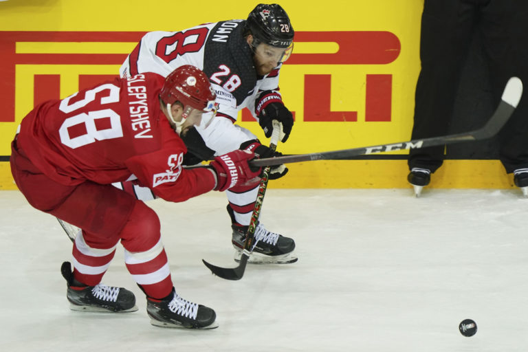 Kanadský útočnák Connor Brown v súboji s Rusom Antonom Slepyševom počas štvrťfinálového zápasu na MS v hokeji 2021. Riga, 3 jún 2021. Foto: SITA/AP.