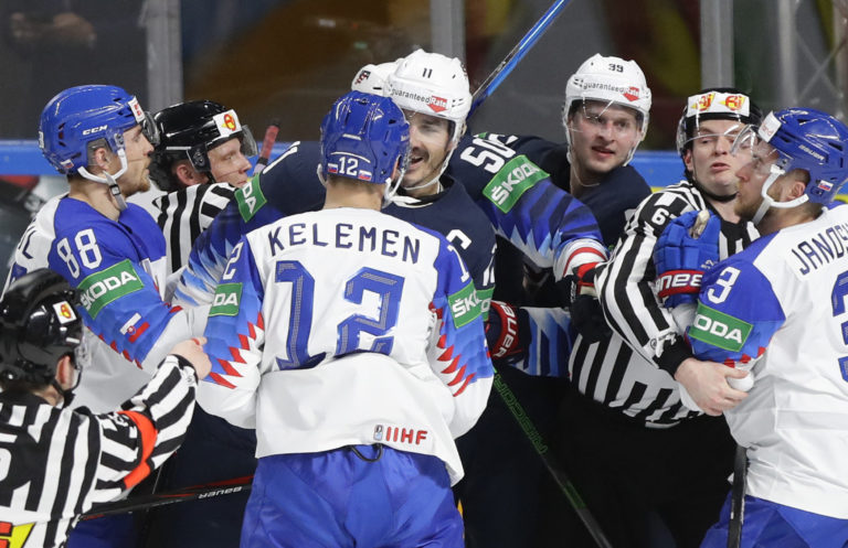 Potýčka vo štvrťfinálovom zápase USA - Slovensko na MS v hokeji 2021. Riga, 3. jún 2021. Foto: SITA/AP.