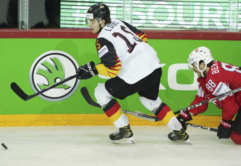 Christoph Bertschy zo Švajčiarska (vpravo) sa snaží zastaviť Stefana Loibla z Nemecka počas štvrťfinálového zápasu na MS v hokeji 2021. Riga, 3. jún 2021. Foto: SITA/AP