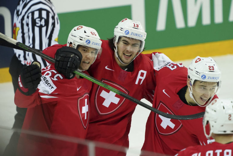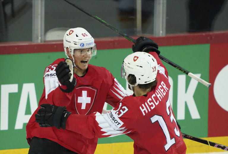 Ramon Untersander (vľvo) a Nico Hischier zo Švajčiarska sa tešia z gólu v bránke Nemecka počas štvrťfinálového zápasu na MS v hokej 2021. Riga, 3. jún 2021. Foto: SITA/AP