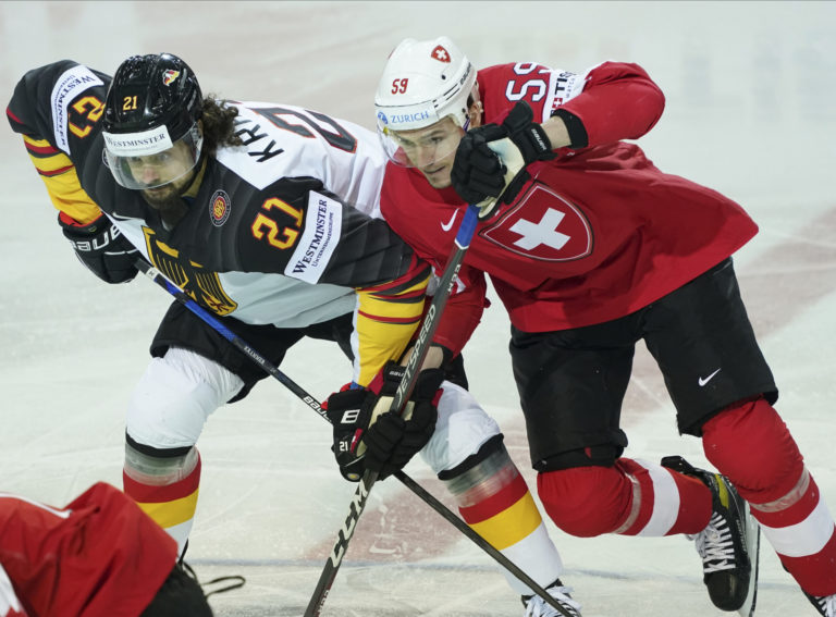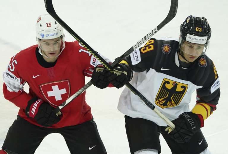 Gregory Hofmann zo Švajčiarska (vľavo) a Leonhard Pfoderl z Nemecka počas štvrťfinálového zápasu na MS v hokeji 2021. Riga, 3. jún 2021. Foto: SITA/AP