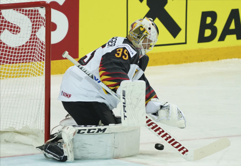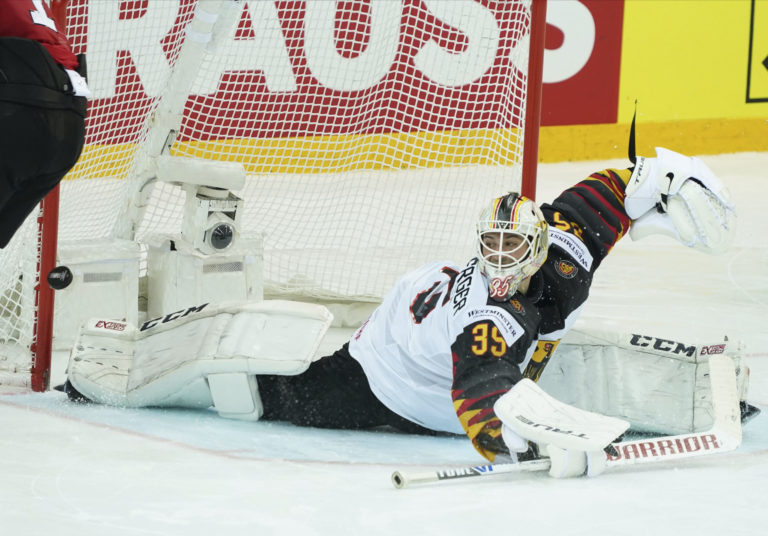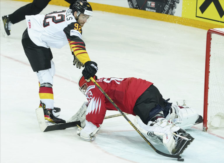 Nemecký brankár Mathias Niederberger zasahuje počas štvrťfinálového zápasu na MS v hokeji 2021 proti Švajčiarsku. Riga, 3. jún 2021. Foto: SITA/AP