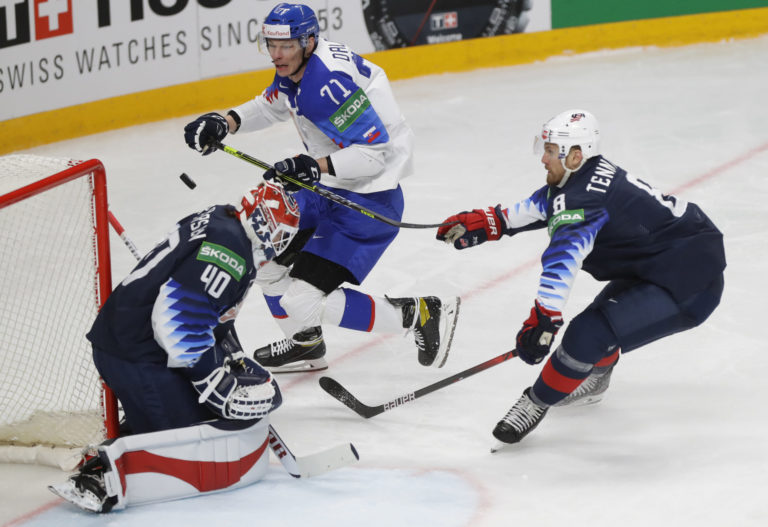 Zákrok amerického gólmana Cala Petersena po zakončení Slováka Marka Ďalogu počas štvrťfinálového zápasu na MS v hokeji 2021. Riga, 3. jún 2021. Foto: SITA/AP.