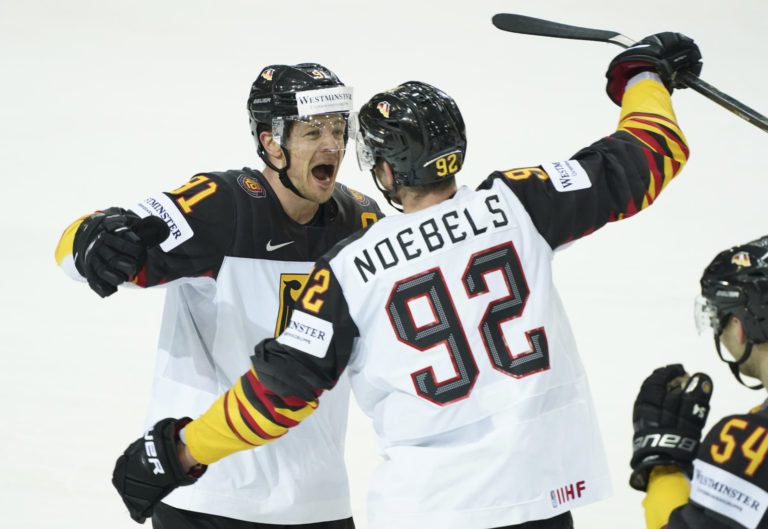 Nemeckí hokejisti Moritz Müller (vľavo) a Marcel Noebels sa radujú z víťazstva vo štvrťfinálovom zápase na MS v hokeji 2021 proti Švajčiarsku. Riga, 3. jún 2021. Foto: SITA/AP