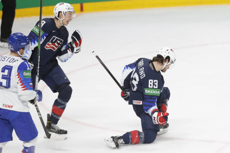 Americký útočník Conor Garland sa teší z gólu v sieti Slovenska počas štvrťfinálového zápasu na MS v hokeji 2021. Riga, 3. jún 2021 Foto: SITA/AP.