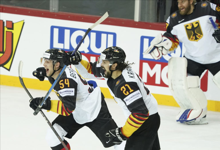 Nemeckí hokejisti sa radujú z víťazstva vo štvrťfinálovom zápase na MS v hokeji 2021 proti Švajčiarsku. Riga, 3. jún 2021. Foto: SITA/AP