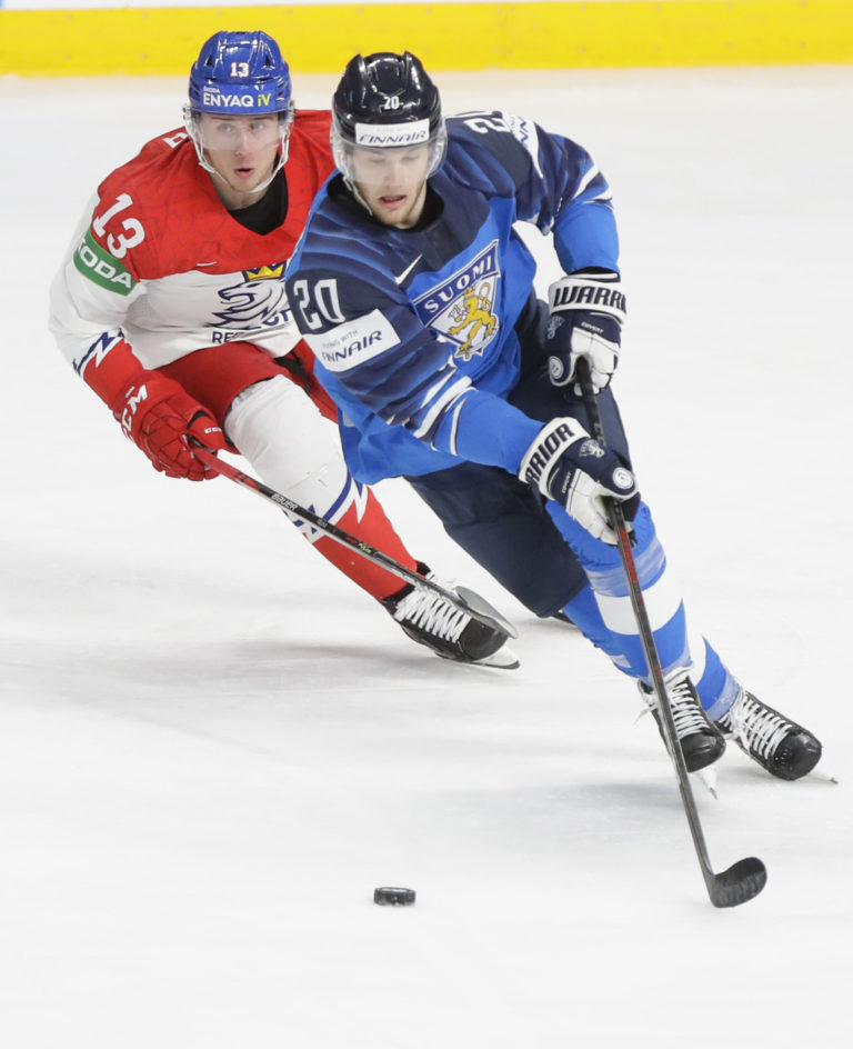 Český útočník Filip Chytil v súboji s Fínom Antonom Lundellom počas štvrťfinálového zápasu na MS v hokeji 2021. Riga, 3 jún 2021. Foto: SITA/AP.