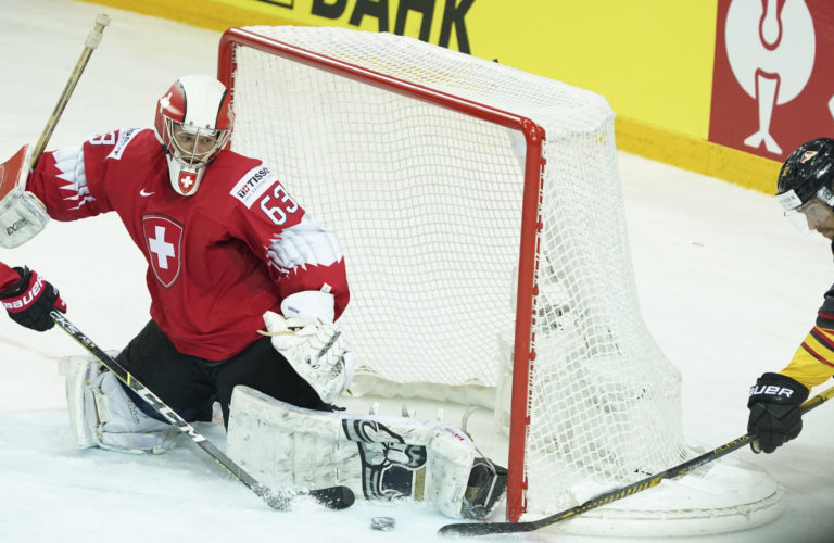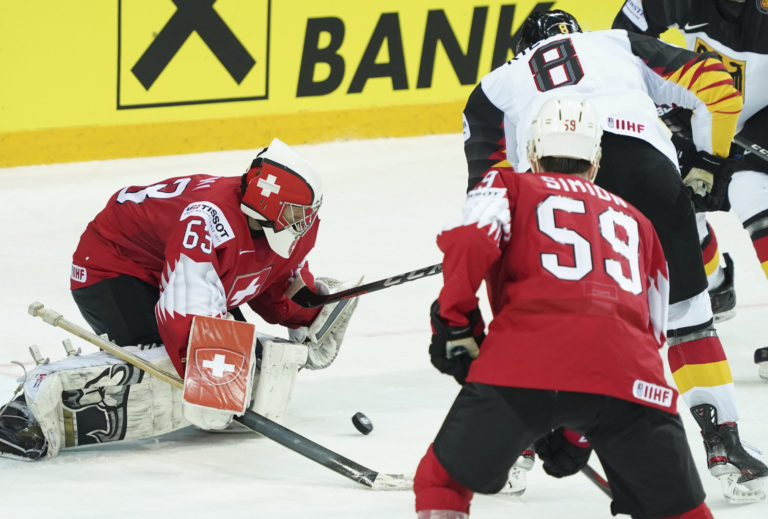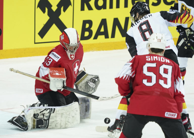 Švajčiarsky brankár Leonardo Genoni zasahuje počas štvrťfinálového zápasu na MS v hokeji 2021 proti Nemecku. Riga, 3. jún 2021. Foto: SITA/AP