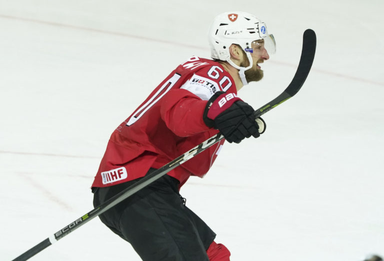 Tristan Scherwey zo Švajčiarska sa teší z gólu v bránke Nemecka počas štvrťfinálového zápasu na MS v hokeji 2021. Riga, 3. jún 2021. Foto: SITA/AP