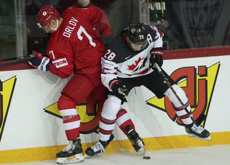Ruský obranca Dmitrij Orlov v súboji s Kanaďanom Connorom Brownom počas štvrťfinálového zápasu na MS v hokeji 2021. Riga, 3 jún 2021. Foto: SITA/AP.