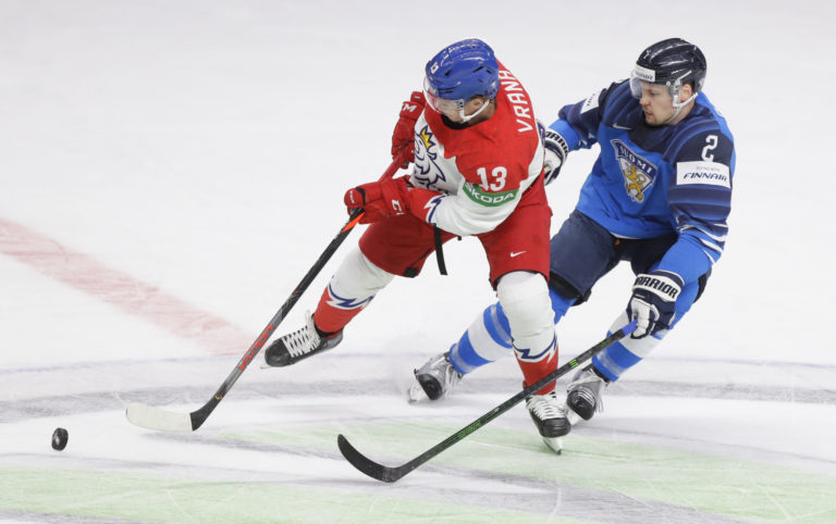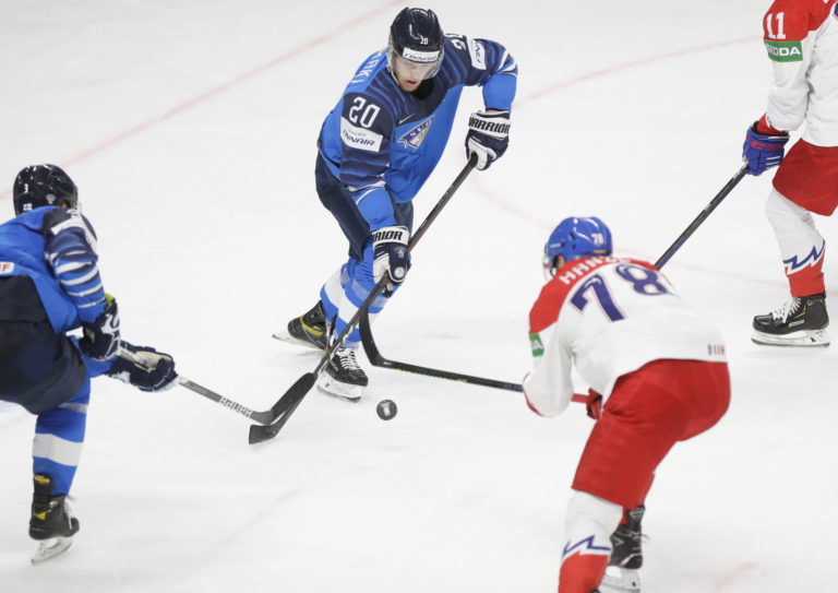 Fín Niko Ojamäki odpaľuje puk počas švrťfinálového zápasu proti Česku na MS v hokeji 2021. Riga, 3. jún 2021. Foto: SITA/AP.