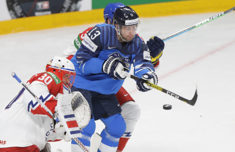 Fínsky útočník Mikael Ruohomaa sa snaží tečovať puk za chrbát českého gólmana Šimona Hrubca počas štvrťfinálového zápasu na MS v hokeji 2021. Riga, 3 jún 2021. Foto: SITA/AP.