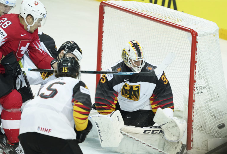 Nemecký brankár Mathias Niederberger (vpravo) zasahuje počas štvrťfinálového zápasu na MS v hokeji 2021 proti Švajčiarsku. Riga, 3. jún 2021. Foto: SITA/AP